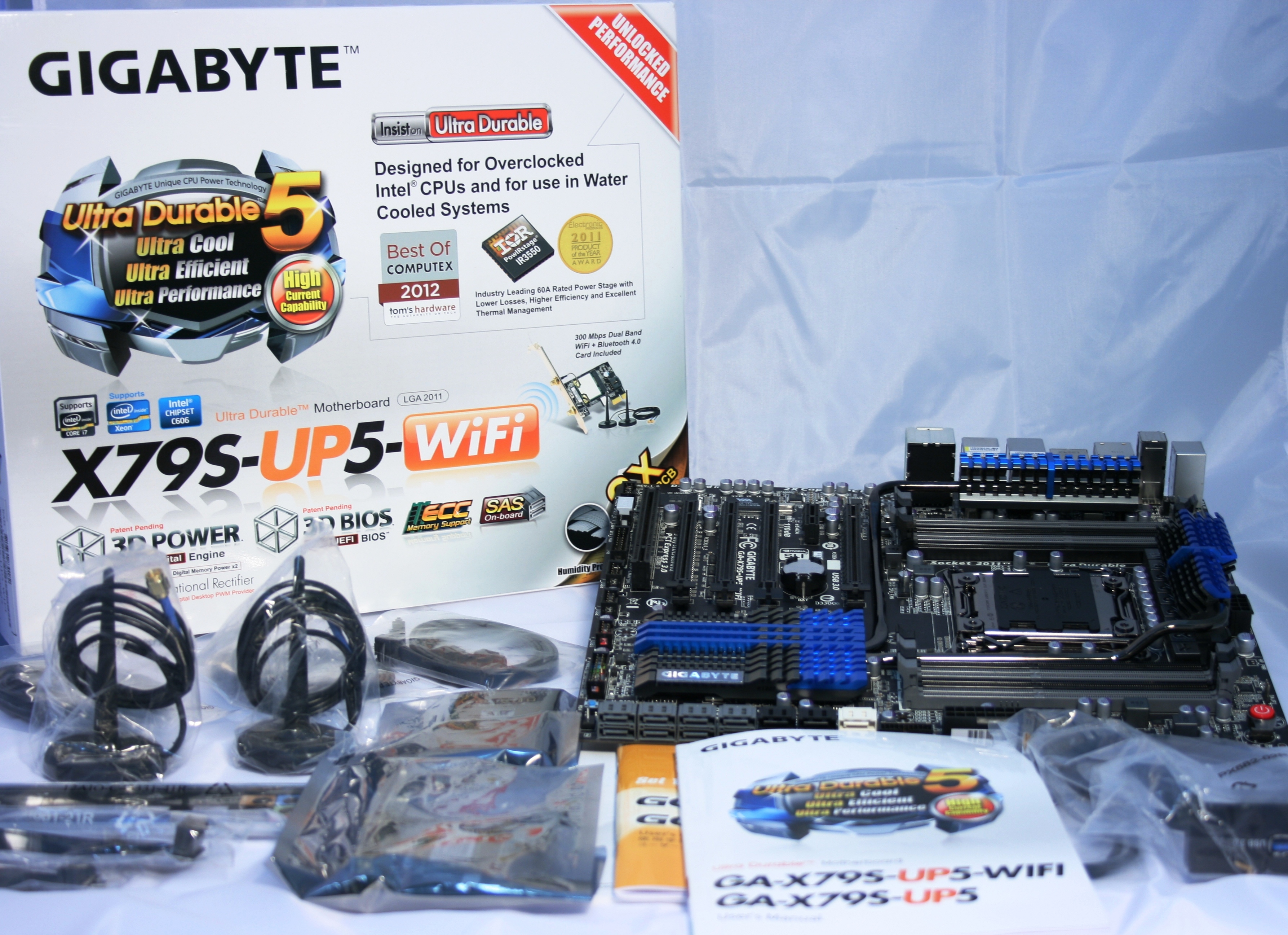 Το X79S-UP5 WiFi ακολουθεί σχεδίαση E-ATX, δηλαδή είναι ελαφρώς μεγαλύτερο σε σχέση με τα υπόλοιπα, απλά ATX motherboards. Η πλακέτα του είναι γεμάτη υποσυστήματα, ενώ και το βάρος του γίνεται άμεσα αντιληπτό, βγάζοντάς το από τη πλούσια συσκευασία, με το σύστημα παθητικής ψύξης να είναι ο βασικός παράγοντας του αυξημένου βάρους. Πέρα από το ίδιο το board, το κουτίπεριέχει τα απαραίτητα manuals, το CD με τους drivers, το μεταλλικό προστατευτικό του backpanel,καλώδια SATA, ένα τριπλό SLI adaptor για σύνδεση έως τριών καρτών με GPU Nvidia, ένα front panel για bay 3,5’’ που προσφέρει δυο εξόδους USB 3.0 και τέλος μια κάρτα PCI-E x1, η οποία προσφέρει στο χρήση δυνατότητες Wifi 802.11n στα 150Mbit καθώς και Bluetooth 4.0. Η κάρτα συνοδεύεται από δυο κεραίες που βιδώνουν στις σχετικές θέσεις που βρίσκονται στο πίσω μέρος της, ώστε να υπάρχει επαρκής κάλυψη των ασύρματων συνδέσεων.