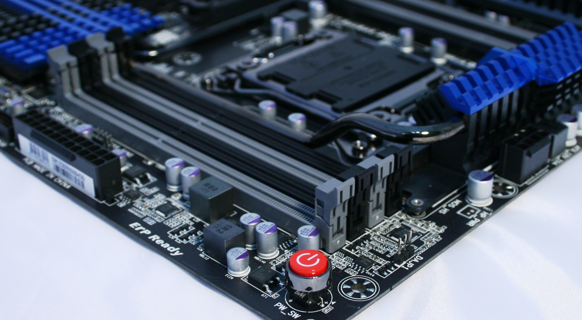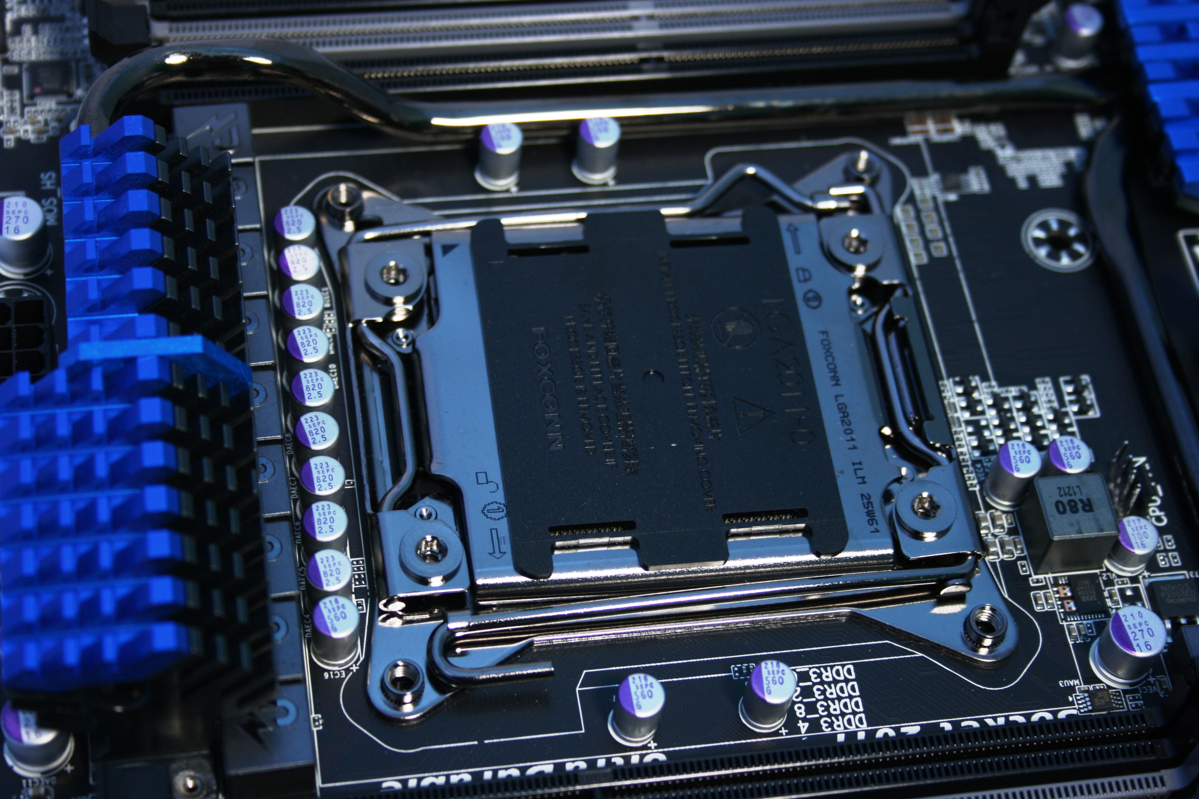Πηγαίνοντας τώρα στο ίδιο το motherboard, πραγματικά έχουμε να κάνουμε με ένα υπερ-πλούσιο μοντέλο. Το socket του επεξεργαστή καλύπτει ένα μεγάλο μέρος της επιφάνειας καθώς μιλάμε ούτως ή άλλως για το μεγαλύτερο σε διαστάσεις socket που έχει παρουσιάσει η Intel τα τελευταία χρόνια. Πάνω και κάτω από αυτό, συναντάμε τις δυο τετράδες από θέσεις μνήμης, με το μέγιστο ποσό μνήμης που μπορεί να εγκαταστήσει κάποιος να φτάνει στα 64GB!