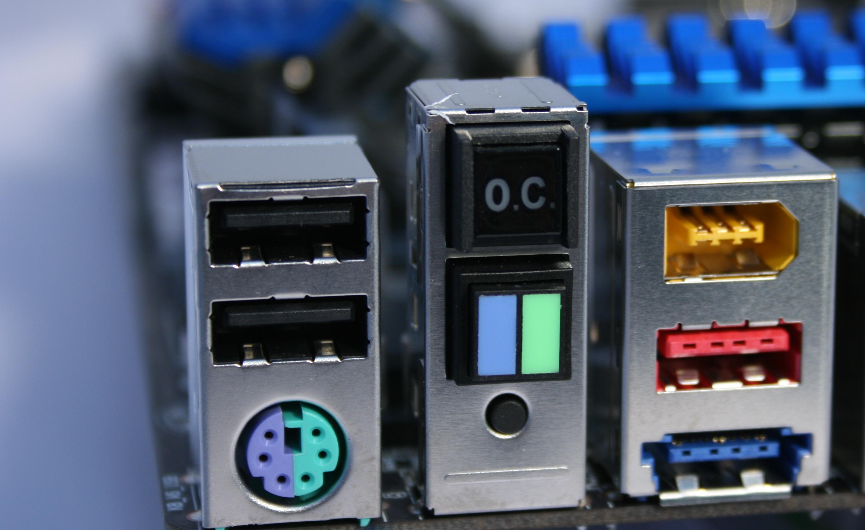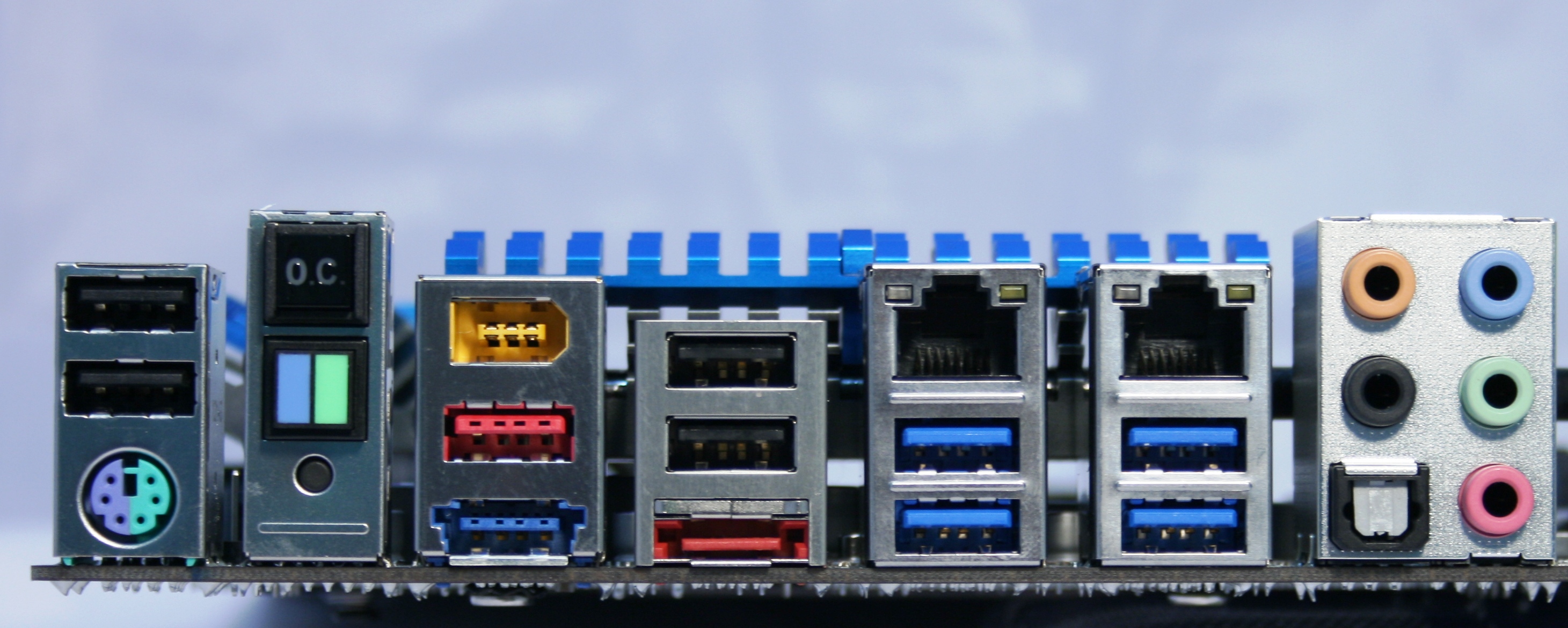 Πηγαίνοντας τώρα στο backpanel, βρίσκουμε μια κλασσική διάταξη που περιλαμβάνει μεταξύ άλλων τις εισόδους και εξόδους ήχου, τέσσερις θύρες USB 3.0 και άλλες 2 USB 2.0, ένα ζευγάρι θυρών Gigabit Lan, μια PS/2 και μια Firewire, καθώς και δυο πλήκτρα. Το πλήκτρο O.C. κάνει αυτόματο overclocking, ενώ κάτω από αυτό βρίσκεται το πλήκτρο για να καθαρίσουμε τις ρυθμίσεις του BIOS στην περίπτωση που κάτι πάει στραβά όσον αφορά στις προσπάθειες για overclocking.