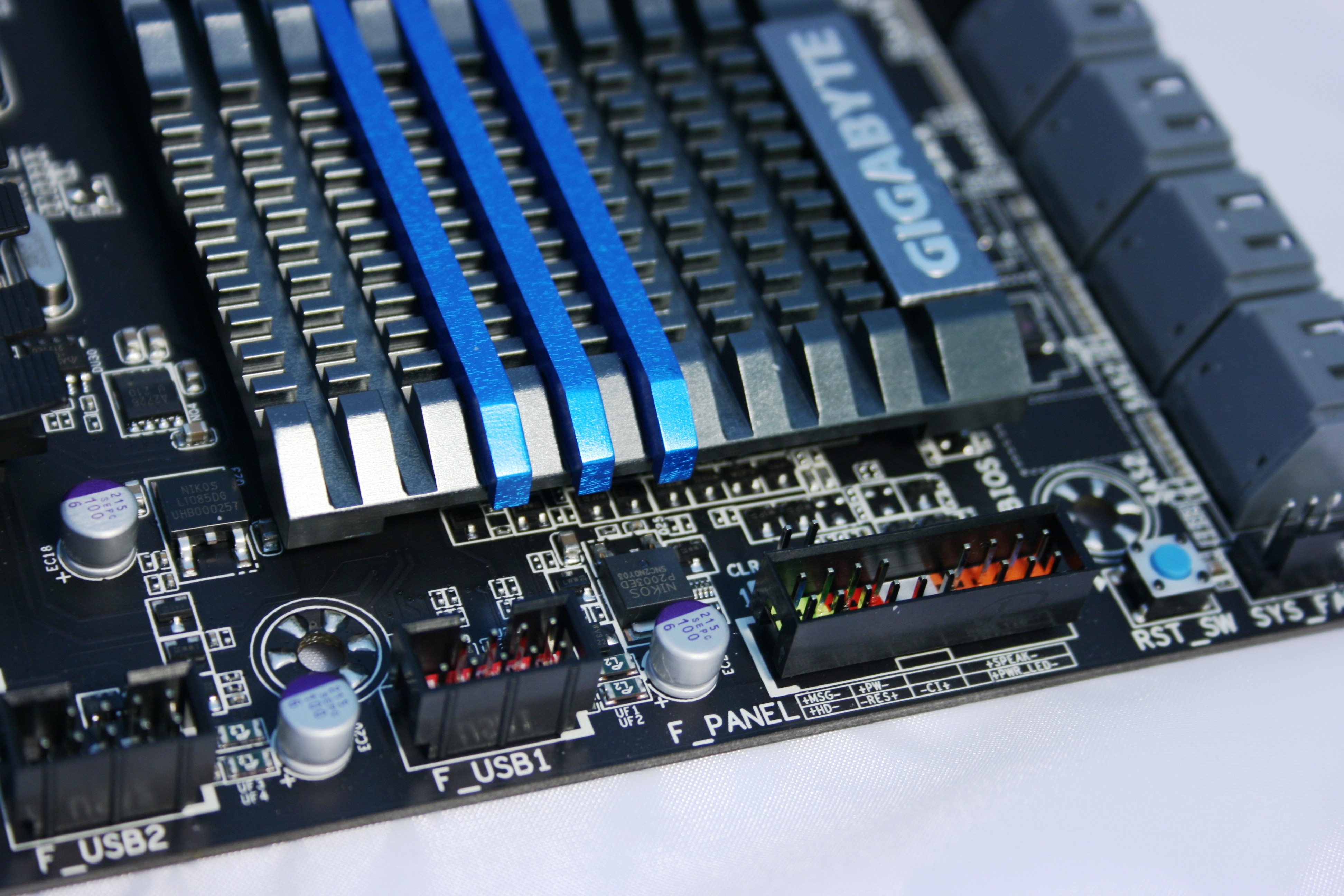 Η προστασία από την υγρασία είναι σημαντική κυρίως γι' αυτούς που ασχολούνται με τοoverclocking σε συνθήκες ψύξης και επιτυγχάνεται χάρη στη χρήση μιας νέας επίστρωσης που τοποθετείται στην πλακέτα. Ένα από τα βασικά υποσυστήματα που έχει επιλέξει η Gigabyte και παίζουν σημαντικό ρόλο στη ποιότητα της κατασκευής και στις αυξημένες αντοχές του motherboard είναι τα νέας γενιάς MOSFET που στη προκειμένη περίπτωση είναι τα IR3550 PowIRstage. Λειτουργώντας σε χαμηλότερες θερμοκρασίες, έχουν αυξημένες αντοχές σε ακραίες συνθήκες χρήσης, ενώ ταυτόχρονα εξοικονομούν και ενέργεια. Πηγαίνοντας τώρα στο ίδιο το motherboard, πραγματικά έχουμε να κάνουμε με ένα υπερ-πλούσιο μοντέλο. Το socket του επεξεργαστή καλύπτει ένα μεγάλο μέρος της επιφάνειας καθώς μιλάμε ούτως ή άλλως για το μεγαλύτερο σε διαστάσεις socket που έχει παρουσιάσει η Intel τα τελευταία χρόνια. Πάνω και κάτω από αυτό, συναντάμε τις δυο τετράδες από θέσεις μνήμης, με το μέγιστο ποσό μνήμης που μπορεί να εγκαταστήσει κάποιος να φτάνει στα 64GB!