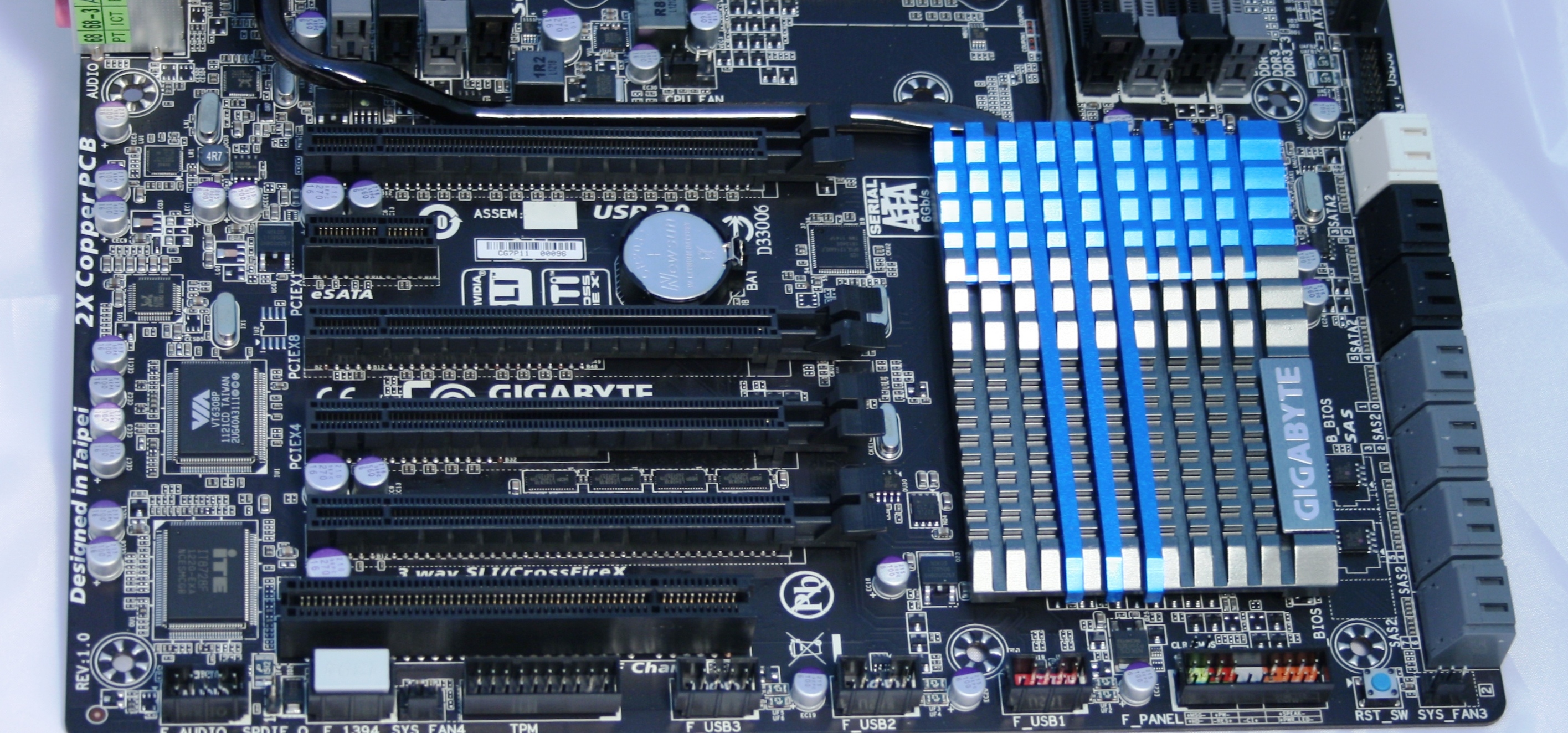 Από πλευράς θυρών PCI-Express και εδώ τα πράγματα είναι υπερπλήρη, αφού συναντάμε συνολικά τέσσερις πλήρους μήκους PCI-E θύρες, με τις μεταξύ τους αποστάσεις να είναι τέτοιες ώστε ο κάτοχος του motherboard να μπορεί να τοποθετήσει έως τρεις διπλού πάχους κάρτες γραφικών, είτε με GPU Nvidia είτε με AMD. Επιπλέον, βρίσκουμε μια PCI-E x1, ενώ υπάρχει και μια απλή PCI για όσους έχουν κάποια παλιά κάρτα τέτοιου τύπου. Εκεί που το motherboard πραγματικά παίρνει άριστα, είναι στον τομέα της σύνδεσης σκληρών δίσκων. Είπαμε νωρίτερα ότι υποστηρίζει το πρότυπο SAS, αλλά αυτό που δεν είπαμε είναι ότι μπορεί να δεχτεί έως 8 τέτοιουςδίσκους και μάλιστα όλοι αυτοί να λειτουργήσουν σε RAID, ώστε ο χρήστης να απολαμβάνει τις μέγιστες επιδόσεις.