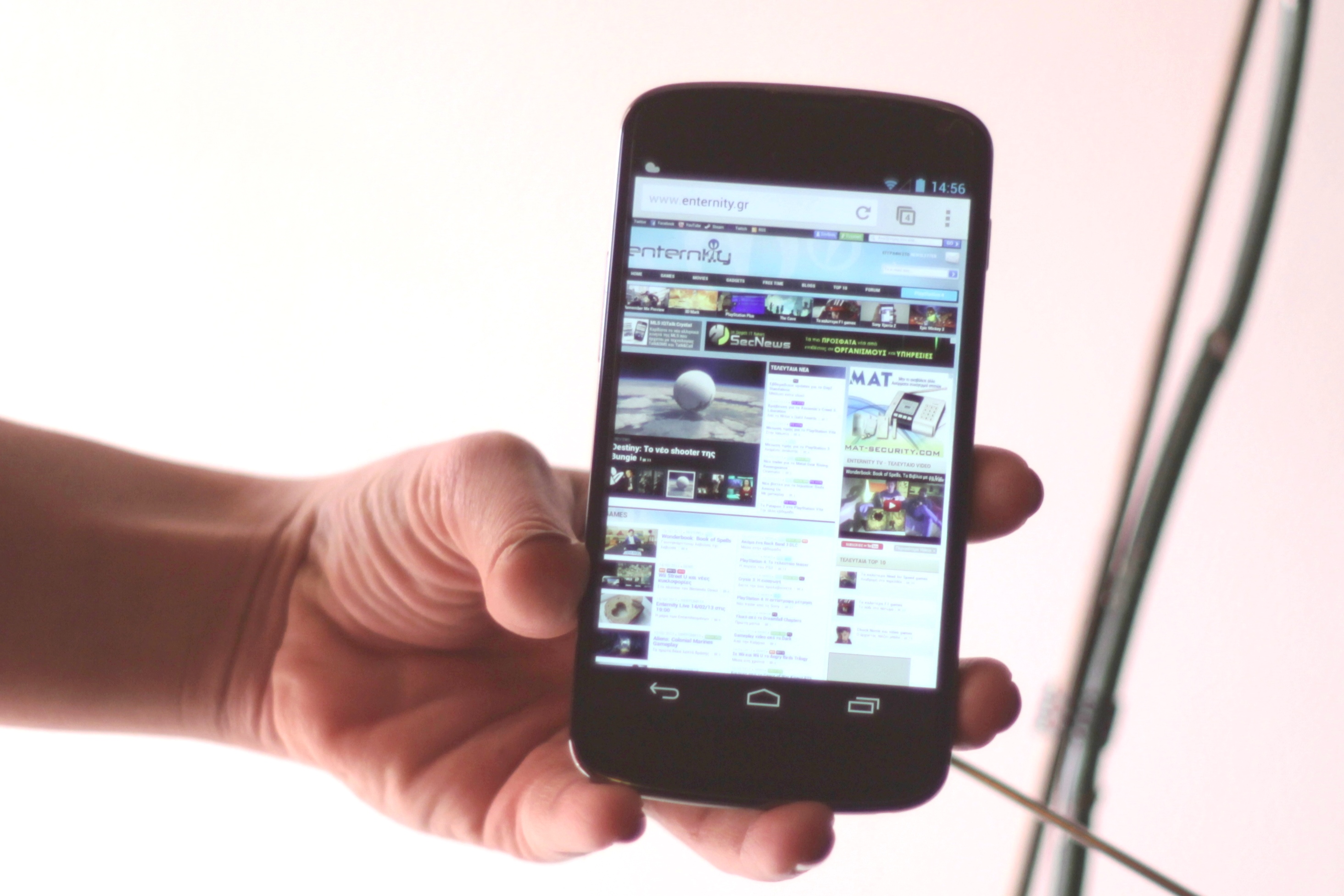 Χρωματικά, η οθόνη προσφέρει κάπως αδιάφορα χρώματα και όσοι έχουν δει συσκευές σαν τοGalaxy S III της Samsung -με κορεσμένα χρώματα- θα νομίσουν ότι η οθόνη του Nexus 4 δεν είναι τόσο καλή. Το συγκεκριμένο θέμα πάντως έχει να κάνει περισσότερο με τα θέλω του κατόχου και όχι με την απόδοση της οθόνης, η οποία μπορεί με ειδικό software που βρίσκεται κανείς στο Play Store να αλλάξει. Οι γωνίες θέασης είναι αρκετά καλές, χωρίς όμως να αποκλείεται η μείωση αντίθεσης και χρωματικής απόδοσης. Συνολικά όμως η οθόνη αφήνει πολύ καλές εντυπώσεις και είναι ένα από τα δυνατά χαρτιά του Nexus 4.Πηγαίνοντας τώρα στα ενδότερα της συσκευής, τα πράγματα είναι ακόμα καλύτερα καθώς το Nexus 4 είναι μια από τις πρώτες συσκευές που βασίζονται σε hardware νέας γενιάς. Συγκεκριμένα, η LGτο έχει εφοδιάσει με ένα τετραπύρηνο επεξεργαστή Qualcomm APQ8064 Snapdragon που λειτουργεί στο 1,5GHz, συνοδεύεται από 2GB μνήμης και λειτουργεί σε αρμονική συνεργασία με το επίσης φρέσκο υποσύστημα γραφικών Adreno 320 του ίδιου κατασκευαστή. Το «πακέτο» είναι από τα ισχυρότερα που μπορεί να βρει κάποιος σε συσκευές με Android, προσφέροντας όλα όσα θα ήθελε ένας χρήστης: γρήγορο επεξεργαστή, μεγάλη μνήμη και δυνατό υποσύστημα γραφικών. Αν και σε κάποια javascript benchmarks τα νούμερα που πήραμε δεν είναι καθόλου εντυπωσιακά, αφού αρκετές συσκευές βρέθηκαν ταχύτερες (Xperia T, LG Optimus 4X, Optimus Vu), αυτό σε μεγάλο βαθμό οφείλεται στη χρήση του Chrome σαν βασικού browser, καθώς είναι αρκετά πιο αργός σε javascript σε σχέση με άλλους browser.